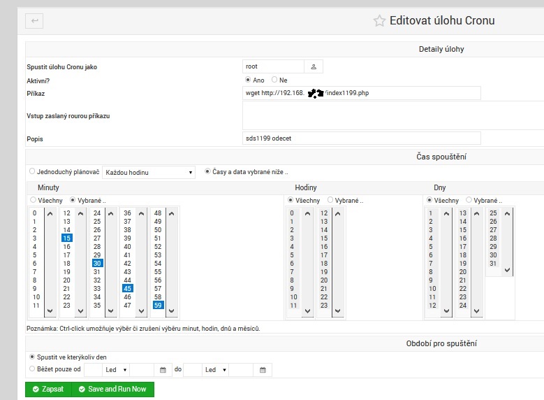 To je dobré při rychlém odečtu, co se děje. Jinak samozřejmě se založí na serveru úloha v Cronu s časovým intervalem. Já ji vždy zakládám Webminem, protože nejsem King. Nastavení vypadá asi takto.