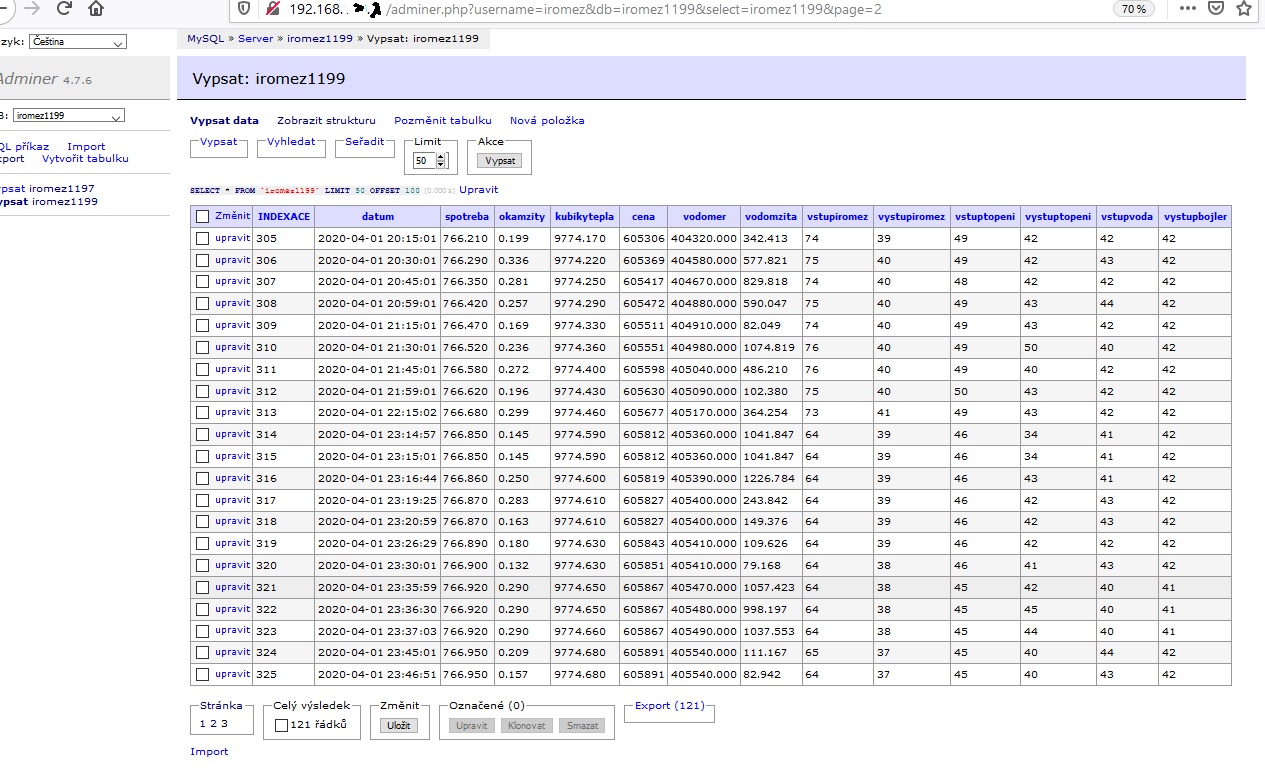 6. Nahrání spouštěcího souboru na linux LAMP server( stačí i nakonfigurované Raspberry Pi) " index1199", většinou do adresáře var/www/. Dát tomu práva na spuštění. Dále si v souboru naeditovat své jméno a heslo do databáze Mysql /já iromez, xxx) vytvořit databázi (já iromez), zadat IP adresu SDS 192.168.xx.xxx/xml.xml. Proměnné spotreba, okamzity,..... si může každý naeditovat a změnit dle libosti. Tak a teď přijde na řadu tabulka databáze Mysql. Než něco vymýšlet stačí importovat moji databázi a odmazat data. Tabulky jsou v databázi dvě. Máme dva výměníky, ale stačí 1197čku deletovat. A nastává největší sranda. Píšeme do Exploreru ip adresu LAMP serveru/index1199.php a mělo by se objevit